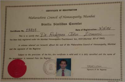 Dr. John Rodrigues has graduated and received his L.C.E.H from BOMBAY HOMOEOPATHIC MEDICAL COLLEGE, MUMBAI (now known as Smt. Chandaben Mohanbhai Patel Homoeopathy Medical College) in the year 1985. He also acquired doctorate in alternative medicine (M.D) He is an experienced classical Homoeopath practicing since the year 1986.